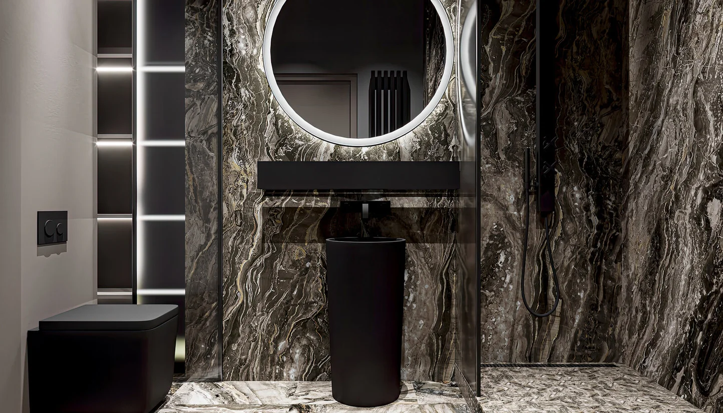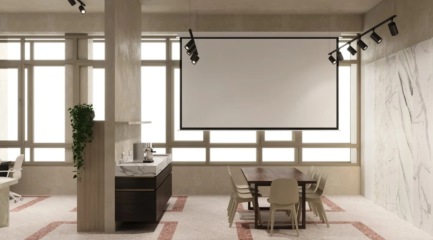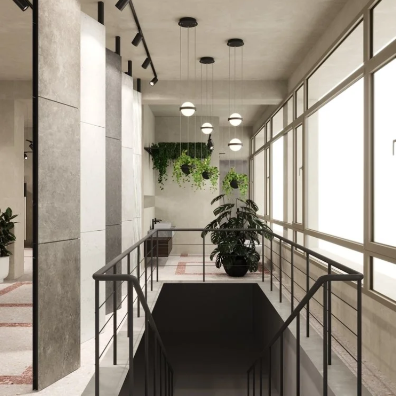 - Материалы: Анодированный алюминий, стекло с напылением, перфорированный металл, полированный бетон с интегрированной подсветкой.