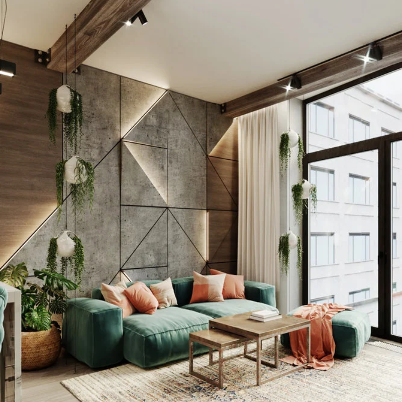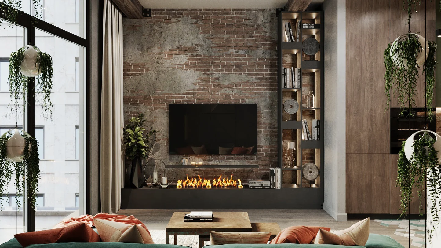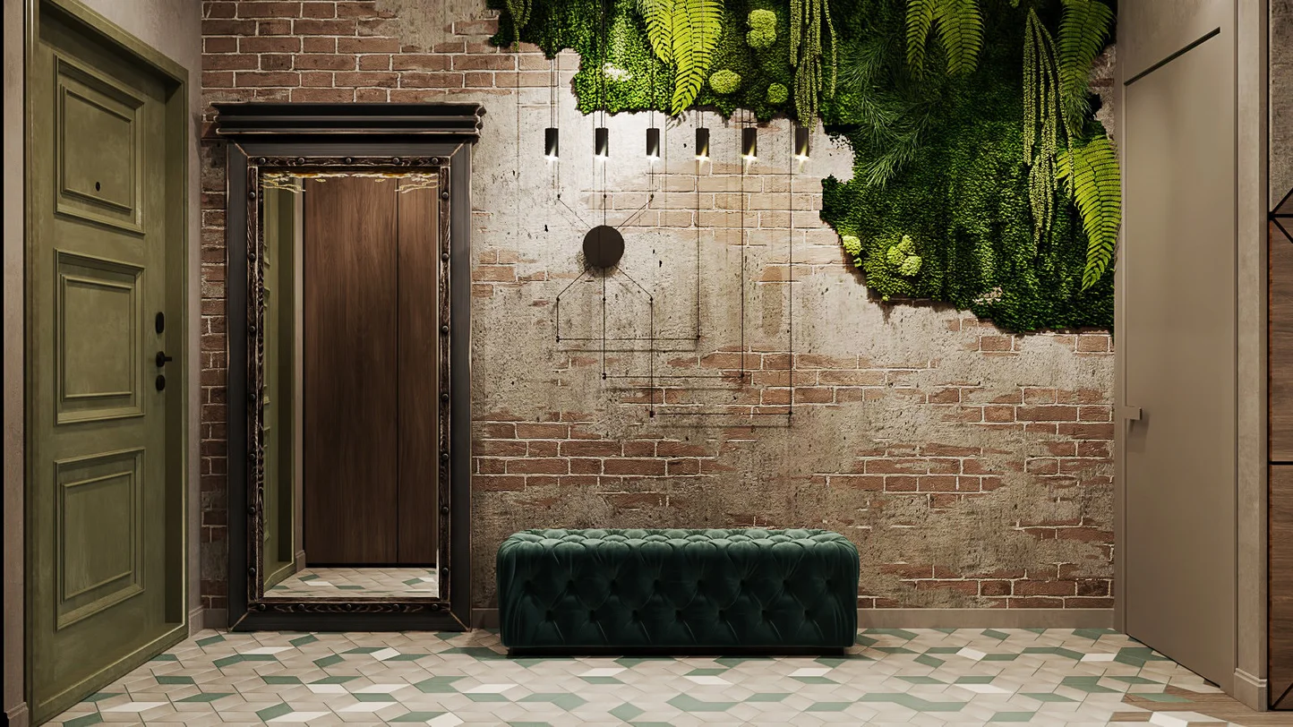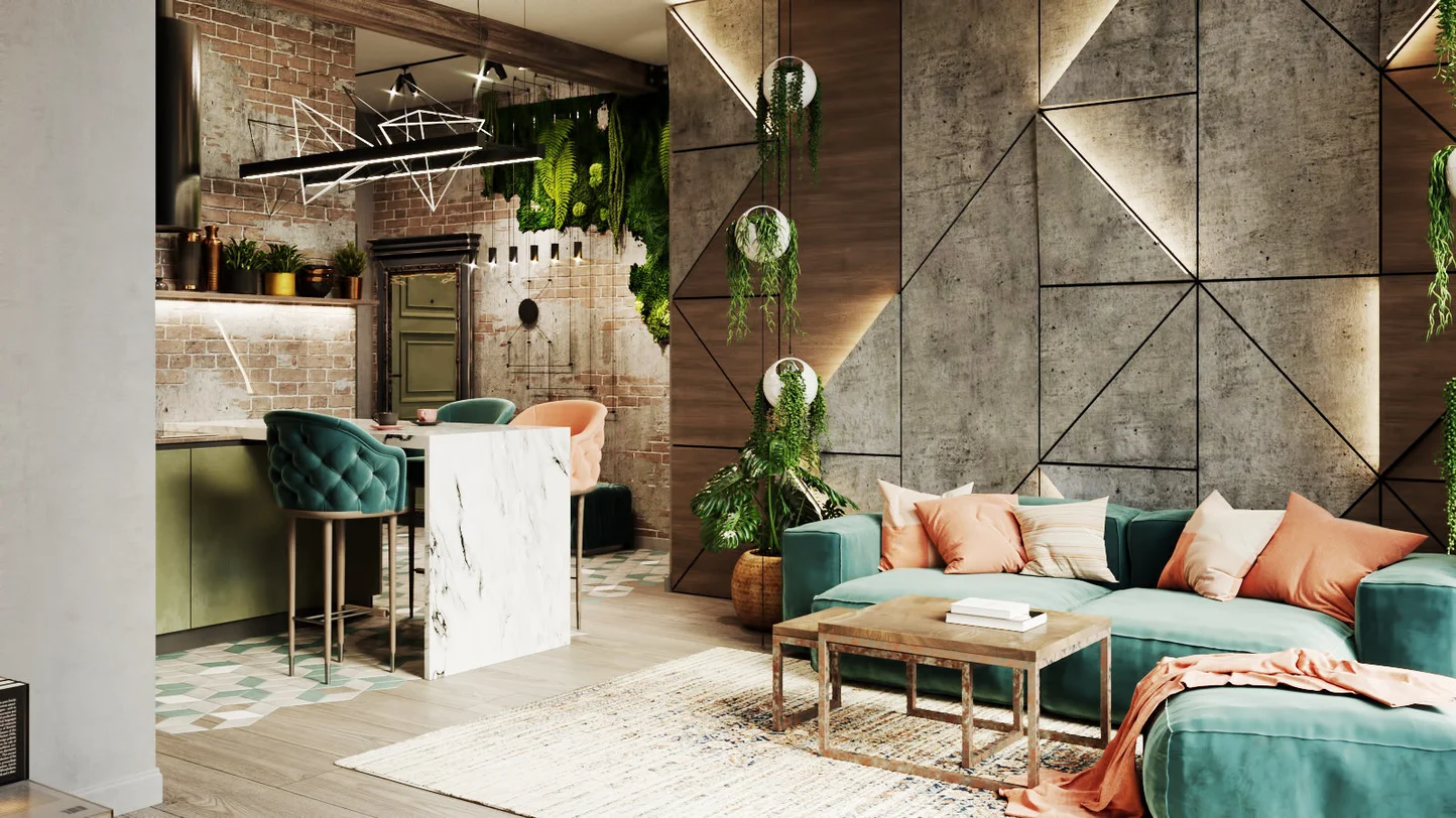Суть: Максимальное слияние урбанистической эстетики с природой. Этот биофильный лофт — главный тренд 2026 в премиум-сегменте. Если вы планируете создать индустриальный интерьер квартиры с акцентом на экологию, это ваш выбор.