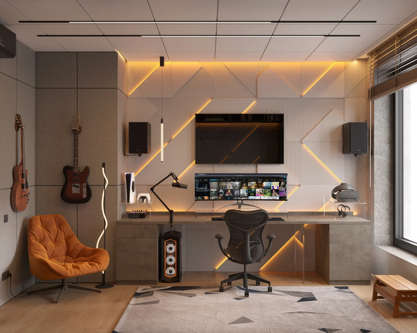 - Потолки: Натяжные потолки с фотопечатью под бетон или ржавый металл, гипсовые 3D-панели с геометричным рельефом.