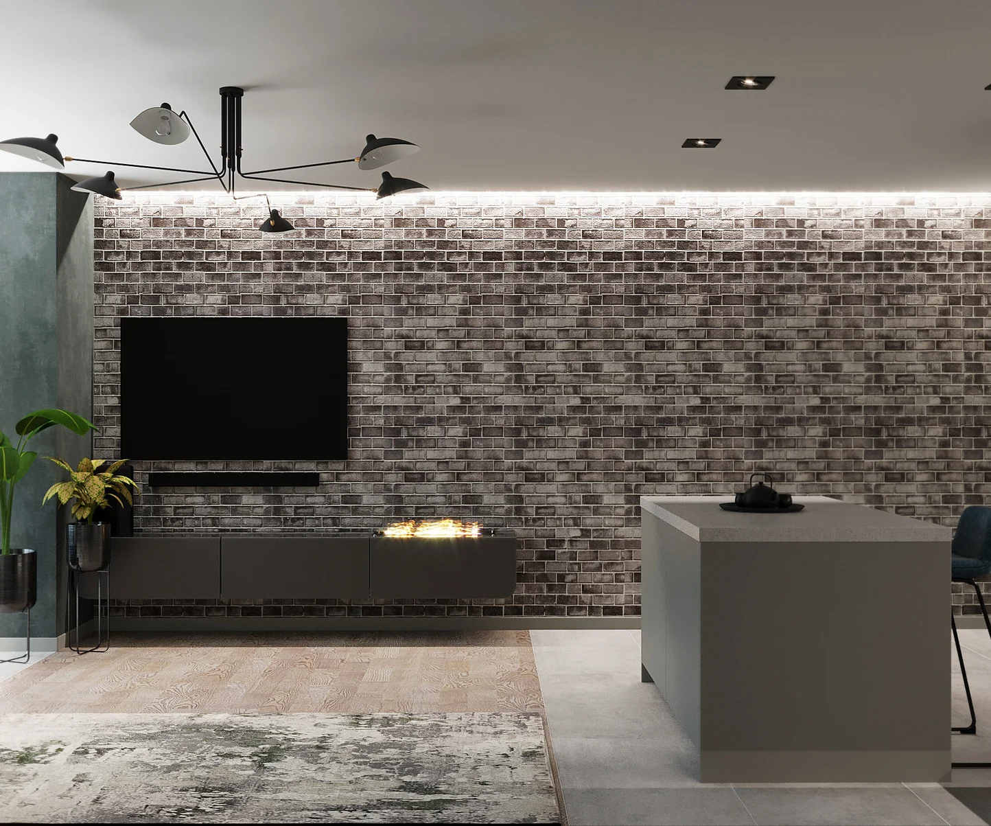 - Стены: Гибкий кирпич из полиуретана, тонкий клинкерный кирпич, декоративные бетонные плиты (HPL-пластик) или микроцемент.